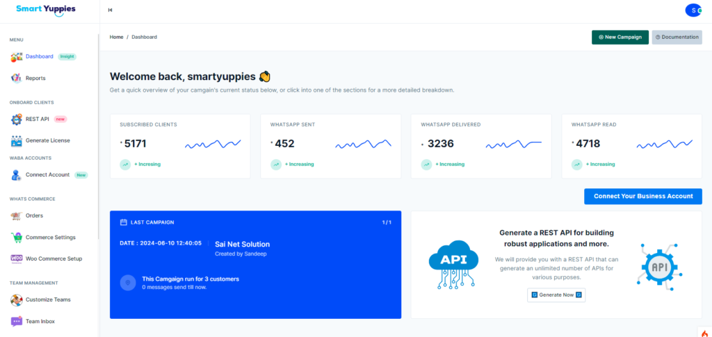 - Manage your team effectively with centralized communication, task assignment and tracking, and enhanced collaboration using SmartYuppies' WhatsApp API CRM.